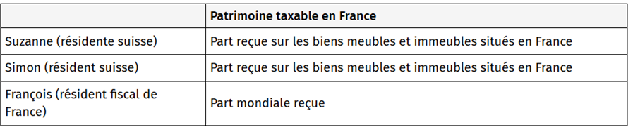 Switzerland will normally tax the entire estate (with the exception of immovable property situated abroad) and France, by default, movable and immovable property situated in France. The situation becomes somewhat more complicated for François, whose tax residence is in France. In his case, France may tax all the assets received in his capacity as an heir (he may, however, benefit from a tax credit limited to the tax paid in Switzerland in accordance with the common provisions of the CGI).