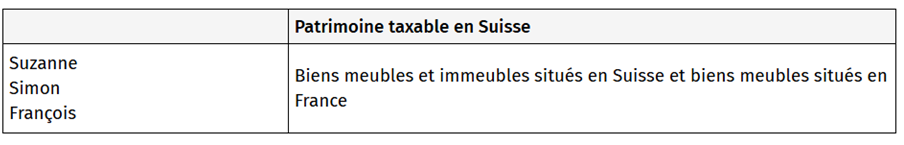 La Suisse taxera normalement l’ensemble de la succession (à l’exception des biens immobiliers situés à l’étranger) et la France, par défaut les biens meubles et immeubles situés en France. La situation se complique quelque peu pour François, dont la Résidence fiscale est française. Le concernant, la France pourra peut taxer l’ensemble des biens reçus en sa qualité d’héritier (il pourra néanmoins bénéficier d’un crédit d’impôt limité à l’impôt acquitté en Suisse en application des dispositions communes du CGI).
