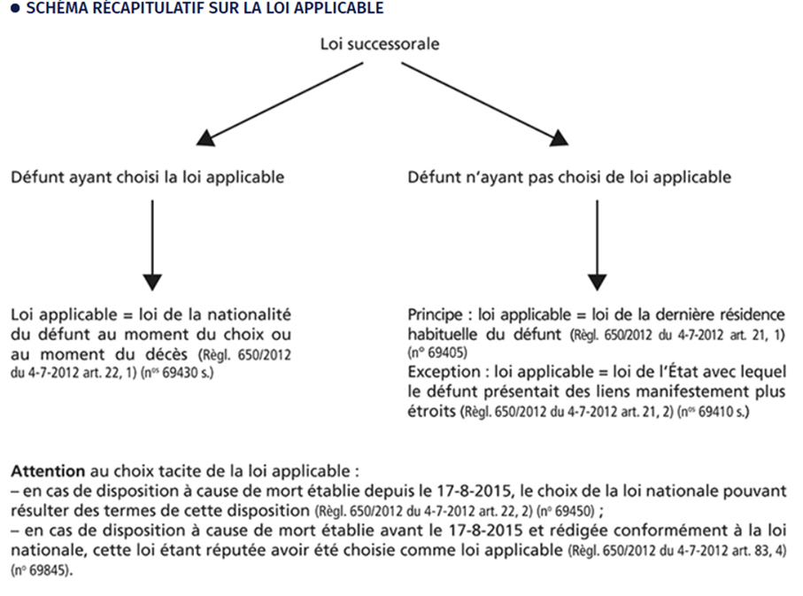 | Loi applicable à une succession | Désigne la loi nationale (en principe unique) régissant l’ensemble des Aspects civils d’une succession, telle que désignée (depuis 2015) par le Règlement Rome IV. | La Loi applicable à une succession régit les Aspects civils de celle-ci, mais n’a aucune incidence sur le Régime fiscal de la succession. |